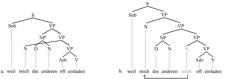 The theoretical analysis of scrambling can vary a lot depending on the theory of sentence structure that one adopts. Constituency-based theories (phrase structure theories) that prefer strictly binary branching structures are likely to address most cases of scrambling in terms of movement (or copying).[8] One or more constituents is assumed to move out of its base position into a derived position. Many other theories of sentence structure, for instance those that allow n-ary branching structures (such as all dependency grammars),[9] see many (but not all!) instances of scrambling involving just shifting; a discontinuity is not involved. The varying analyses are illustrated here using trees. The first tree illustrates the movement analysis of the example above in a theory that assumes strictly binary branching structures. The German subordinate clause weil mich die anderen oft einladen is used, which translates as because the others often invite me: