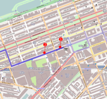 At 2:49 pm EDT (18:49 UTC), two bombs detonated on Boylston Street near Copley Square about 210 yards (190 m) apart,[24][25][26] just before the finish line.[22] The first exploded outside Marathon Sports at 671–673 Boylston Street at 2:49:43 pm EDT.[24] At the time of the first explosion, the race clock at the finish line showed 04:09:43,[27] reflecting the elapsed time since the Wave 3 start at 10:40 am EDT. The second bomb exploded at 2:49:57 pm EDT,[25][28] about 13 seconds later and one block farther west at 755 Boylston Street.[10] The explosions took place nearly three hours after the winner crossed the finish line,[28] but with more than 5,700 runners yet to finish.[29]