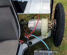 The C5 is powered by a 12-volt lead-acid electric battery which drives a motor with a continuous rating of 250 watts and a maximum speed of 4,100 revolutions per minute. It is coupled with a two-stage gear-drive that increases torque by a factor of 13, without which the motor would not be able to move the vehicle when a person is on board. However, the motor is vulnerable to overheating. The torque increases as the load on the vehicle increases, for instance by going up too steep a gradient.[6] Sinclair's tests showed that it could cope under power with a maximum slope of 1 in 12 (8%) and could manage a 1 in 7 (14%) slope using the pedals.[8] As the speed of the motor reduces, the current flow through its windings increases, drawing up to 140 amps at stall speed. This would very quickly burn the motor out if sustained, so the motor's load is constantly monitored by the C5's electronics. If it stalls under full load the electronics disable the motor after 4 seconds, while if it is under heavy load (around 80 or 90 amps) it trips after two or three minutes. A heat-sensitive resistor inside the motor warns the driver if the vehicle is beginning to overheat and disconnects the motor after a short time, and a third line of defence is provided by a metallic strip mounted on the motor. If an excessive temperature is reached the strip distorts and the power is disconnected.[6]