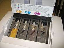 Because solid blocks of ink are used, there is less waste generated than is with laser printers or inkjet printers, which produce empty ink or toner cartridges, in addition to packaging and packing materials. A loose ink block does not leave any residual cartridge after it is consumed - only a crushable, thin, plastic packing tray and a recyclable cardboard packaging box.