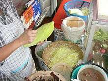 Green papaya salad is a spicy salad made from shredded unripe papaya. It is of Lao origin[1][2][3][4] but it is also eaten throughout Southeast Asia. Locally known in Cambodia as bok l'hong (Khmer: បុកល្ហុង, pronounced [ɓok lhoŋ]), in Laos as tam som (Lao: ຕໍາສົ້ມ) or the more specific name tam maak hoong (Lao: ຕໍາໝາກຫຸ່ງ, Lao pronunciation: [tàm.ma᷆ːk.hūŋ]), in Thailand as som tam (Thai: ส้มตำ, pronounced [sôm tam]), and in Vietnam as goi du du. Som tam, the Thai variation, was listed at number 46 on World's 50 most delicious foods compiled by CNN Go in 2011.[5]