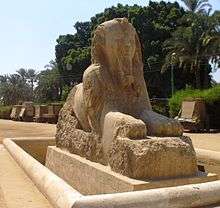 The Sphinx of Memphis is a stone sphinx located near the remains of Memphis, Egypt. The carving was believed to take place between 1700 and 1400 BC, which was during the 18th dynasty.[1] It is unknown which pharaoh is being honored and there are no inscriptions to supply information. The facial features imply that the Sphinx is honoring Hatshepsut or Amenhotep II or Amenhotep III.[1]