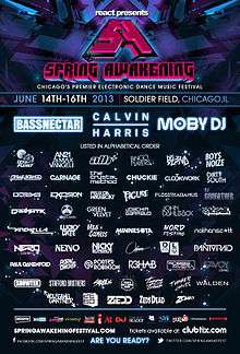 - ↑ "Chicago's Spring Awakening Music Festival reveals 2014 lineup, adds second main stage". Electronic Midwest. 2014-02-04. Retrieved 2016-04-21.