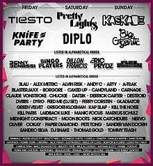 Some of the main artists included Tiesto, Pretty Lights, Diplo, Knife Party, Kaskade, Big Gigantic, Benny Benassi, Bingo Players, Dillon Francis, Eric Prydz, Flux Pavilion, A-Track, Borgore, Caked Up, Carnage, Chuckie, Datsik, DVBBS, Nervo, Dj Snake and more.[12]