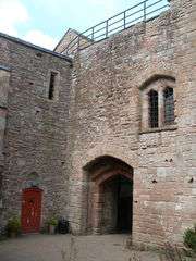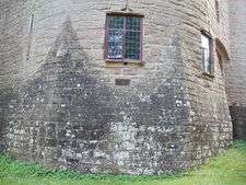 The base of the gatehouse is defended from undermining by large "spurs". This design feature is characteristic of castles in the Welsh Marches, including Goodrich and Tonbridge Castle, but unlike these castles depends on a solid octagonal, rather than square, based interacting with the form of the circular towers.[17] The gatehouse is well defended, except for the upper windows at the rear; the upper floors were designed for high status guests and these windows would have provided adequate light for the chambers.[18] The south-east of the gatehouse is relatively modern, however, having been rebuilt after a past collapse.[16]