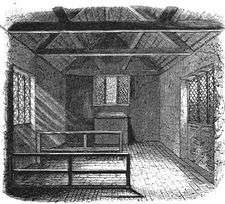 The castle was now principally a prison and a court, still operating under the authority of the constable and the Forest Law originally established in 1217.[59] The remaining buildings inside the bailey were converted into a courtroom and jury room, with the west side of the gatehouse being used as a jail for detaining prisoners.[8] St Briavels Castle was primarily a debtors' prison – in England up until the Debtors' Act of 1869, individuals unable to pay their debts or fines could be detained in prison indefinitely to encourage payment. The conditions in the castle prison became increasingly notorious after a visit from the prison reformer John Howard in 1775 as part of his research for the first edition of his book The State of the Prisons, published two years later. Howard found the prison "greatly out of repair", with the two inmates locked in a single room without exercise for the best of a year, with no fresh water, financial support or firewood.[60] Graffiti on the stone walls of the castle jail includes the mournful inscription by a prisoner of the period "For I have been here a great space; And I am weary of the place."[61]