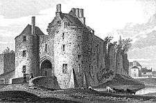 Under Edward I, the massive gatehouse was built to protect the castle entrance, including special protection against undermining.[40] There has been speculation that the royal architect James of Saint George may have been responsible for the building work, which occurred between 1292–3 at a cost of £477.[41] The reason for the king extending the castle at this time is unclear, as the castle was relatively far from the Welsh border and in no particular risk of attack.[42] One popular explanation is that given the quantities of weapons and money being stored at the property by this time, the gatehouse was designed to improve the internal security of the castle; the presence of the additional portcullises would also support this explanation.[42] In 1300, the old wooden chapel was rebuilt in stone and in 1310, an extension to the castle wall was constructed at a cost of £40; called 'the Peel', this followed the line of the old motte and gave additional protection to the keep.[43]