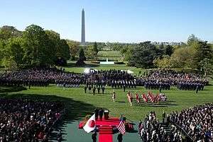 State visits are visits to the United States led by a foreign head of state acting in his or her sovereign capacity. They are, therefore, described as a "visit of [name of state]".[1] State visits can only occur on the invitation of the president of the United States, acting in his capacity as head of the United States. Official visits, in contrast, are usually visits by the chief of government of a foreign state. Like state visits, they can only occur on the invitation of the president of the United States, though are offered in the president's capacity as chief of the federal government of the United States. The visit of a crown prince may also be classified as an official visit. Both state and official visits generally consist of a four-day stay in Washington by the visitor, during which a range of welcoming ceremonies are performed. They are often followed by a tour.[2][3]
