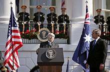 Australian prime minister John Howard responds to George W. Bush's welcoming remarks during an official visit in 2006.