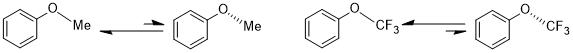 The stereoelectronic effect can have a significant influence in pharmaceutical research. Generally, the substitution of hydrogen by fluorine could be regarded as a way to tune both the hydrophobicity and the metabolism rate. It has a profound influence on conformations. In anisole, the methyl group prefers the coplanar geometry with the phenyl group by about 3.0 kcal/mol, while the trifluoromethoxybenzene favors the O–CF3 bond to be perpendicular to the phenyl group. One explanation is the enhanced steric size of trifluoromethyl group compared to methyl group; yet, more importantly, once the trifluomethyl group rotates outside the phenyl plane, which orienting the C–F bond antiperiplanar (with the [C(aryl)–C(aryl)–O–C(F3)] dihedral angle in the energy minimized structure being around 90°) to the nonbonding orbital (the lone pair) on the oxygen atom which can benefit more of the stereoelectronic effect (n(O) → σ*(C–F)).[9]