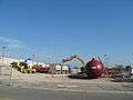 Several large tanks at an airport. For scale, note concrete highway barriers.