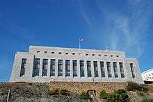 Stripped Classicism (or "Starved Classicism" or "Grecian Moderne")[1] is primarily a 20th-century classicist architectural style stripped of most or all ornamentation, frequently employed by governments while designing official buildings. It was adapted by both totalitarian and democratic regimes.[upper-alpha 1] The style embraces a "simplified but recognizable" classicism in its overall massing and scale while eliminating traditional decorative detailing.[3][4][5][6] The orders of architecture are only hinted at or are indirectly implicated in the form and structure.[upper-alpha 2]