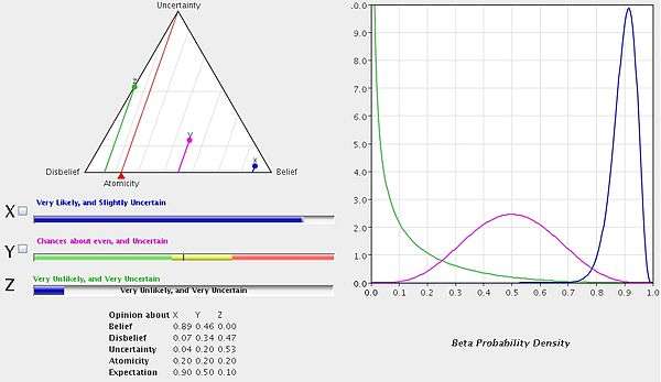 Binomial opinions can be represented on an equilateral triangle as shown below. A point inside the triangle represents a triple. The b,d,u-axes run from one edge to the opposite vertex indicated by the Belief, Disbelief or Uncertainty label. For example, a strong positive opinion is represented by a point towards the bottom right Belief vertex. The base rate, also called the prior probability, is shown as a red pointer along the base line, and the projected probability, , is formed by projecting the opinion onto the base, parallel to the base rate projector line. Opinions about three values/propositions X, Y and Z are visualized on the triangle to the left, and their equivalent Beta PDFs (Probability Density Functions) are visualized on the plots to the right. The numerical values and verbal qualitative descriptions of each opinion are also shown.
