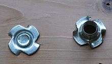 A T-nut, T nut, or tee nut (also known as a blind nut,[1] which can however also refer to a rivet nut or an insert nut) is a type of nut used to fasten a wood, particle or composite materials workpiece, leaving a flush surface.