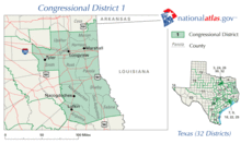 Texas's First congressional district in the United States House of Representatives is a Congressional district that serves the northeastern portion of the state of Texas. As of the 2000 Census, the First District represents 651,619 people. It consists largely of three small East Texas metropolitan areas—Lufkin-Nacogdoches, in the south, Longview-Marshall, and Tyler.