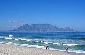 ![]() View of Table Mountain and Cape Town seen from Bloubergstrand. Table Mountain is flanked by Devil's Peak on the left and Lion's Head on the right. | |