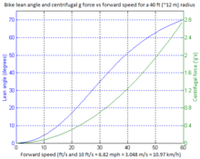 where v is the forward speed, r is the radius of the turn and g is the acceleration of gravity.[48] This is in the idealized case. A slight increase in the lean angle may be required on motorcycles to compensate for the width of modern tires at the same forward speed and turn radius.[45]