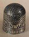 During the First World War, silver thimbles were collected from "those who had nothing to give" by the British government and melted down to buy hospital equipment.[10] In the 1930s and 1940s glass-topped thimbles were used for advertising. Leaving a sandalwood thimble in a fabric store was a common practice for keeping moths away.[11] Thimbles have also been used as love-tokens and to commemorate important events. People who collect thimbles are known as digitabulists. One superstition about thimbles says that if you have three thimbles given to you, you will never be married.[12]