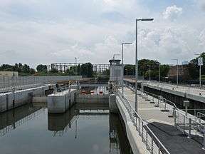 A site in the river, just south of this lock is the resting place of the remains of the Euston Arch.[12][13] A footbridge for pedestrians and a fish pass for migrating fish is incorporated into the design of the lock,[6] and British Waterways claim there will be associated improvements to the navigation and tow path, as a part of the Olympic legacy.