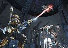 Too Human is an action role-playing game from a third-person perspective. The player takes control of the lead character Baldur in a third-person perspective with the camera distance being adjustable, even controllable during some in-game cinematics to involve the player in the story further.[4] Camera control is limited to player, with the choice to re-adjust the camera back to its default third-person view being the primary following the player and swinging when the player does the same, similar to an auto targeting system.[4] This is because the right analog stick is used for melee combat, instead of traditional camera control, with certain attacks and combos being executed by pushing the stick in the direction of the target with follow-up stick movements applying further attacks with projectile attacks only using an auto lock-on system.[4] Attacks can be combined to execute attacks such as performing combos on enemies in mid-air, attack slides, and juggling foes in the air with projectile weapon attacks.[5] Another aspect of combat are "Ruiner" attacks, powerful abilities that can indirectly affect surrounding enemies and can be mixed with other attacks to perform finishing strikes.[6]