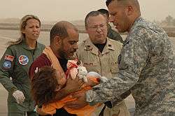 An U.S. Army Soldier and a Turkish Air Force member transport an Iraqi child to safety during a multinational humanitarian airlift effort on Kirkuk Air Base, Iraq, July 8, 2007. The victim was hurt in an attack in Tuz Khurmato.