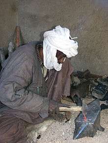 These social strata, like caste systems found in many parts of West Africa, included singers, musicians and story tellers of the Tuareg, who kept their oral traditions.[54] They are called Agguta by Tuareg, have been called upon to sing during ceremonies such as weddings or funerals.[55] The origins of the artisanal castes are unclear. One theory posits a Jewish derivation, a proposal that Prasse calls "a much vexed question".[53] Their association with fire, iron and precious metals and their reputation for being cunning tradesman has led others to treat them with a mix of admiration and distrust.[53]