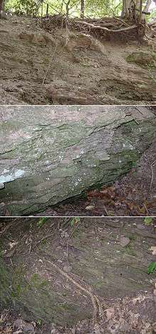 ![]() Various colors and textures of Towaco Formation seen within Pines Lake area of Wayne, New Jersey. | |