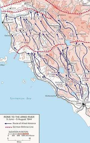 Between 4 June and 16 June, whilst maintaining contact with the advancing Allies, Albert Kesselring executed a remarkable and unorthodox maneuver with his depleted divisions, resulting in his two armies aligning and uniting their wings on the defensive positions on the Trasimene Line.[1] Remarkable though this was, he was probably helped by the confusion caused in the Allied advance by the relieving of II and VI Corps (substituted by U.S. IV Corps and the French Expeditionary Corps). British X Corps had also been brought into the line on XIII Corps' right whilst V Corps had been relieved by Polish II Corps.