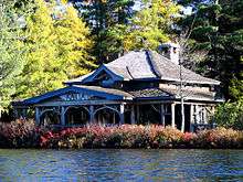 742-acre (3.00 km2) Upper St. Regis Lake is a part of the St. Regis River in the Adirondacks in northern New York State. Along with Lower St. Regis Lake and Spitfire Lake, it became famous in the late 19th century as a summer playground of America's power elite, drawn to the area by its scenic beauty and by the rustic charms of Paul Smith's Hotel. It is the site of many grand old summer "cottages" and Great Camps, including Marjorie Merriweather Post's Topridge. Frederick W. Vanderbilt, Anson Phelps Stokes and Whitelaw Reid were among the summer residents. "The camps of many of these families began as tent colonies, with separate units for sleeping, dining, games, and so on, and evolved into permanent structures built with understated taste."[1]