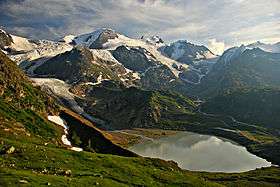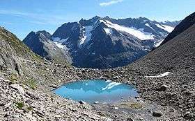 The group south of the Susten Pass forms the dividing range between the head waters of the Aare (west) from those of the Reuss. In addition a small portion of the range (south-west) is located in the basin of the Rhone. This part lies entirely within the valley of the Rhone Glacier. This group forms a complex mass including four considerable ridges and attains its greatest height at the Dammastock and the Galenstock. The group includes four nearly parallel ridges running NNW. and SSE. That forming the eastern boundary of the valley of Hasli reaches 3,383 metres at the Tieralplistock, whence it extends NNW. to the Mährenhorn, and south to the Gärstenhörner. A wide reservoir of snow whence the Trift Glacier flows to the north and the Rhone Glacier to the south, divides this range from the more easterly range whose highest point is the Dammastock. North of the Dammastock the range collectively known as the Hinter Tierberg, attains 3,447 metres. Further east than the last is the Sustenhorn range, rising at its highest point to 3,505 metres, divided from the last by the Stein Glacier and the upper part of the Göschenental. Lastly, another ridge still further east is separated from the last by the Voralptal, a branch of the Göschenental. Its highest summits are the Fleckistock and the Stucklistock. The lower part of the Göschenental is bounded on the south by a range running west to east diverging from the ridge between the Dammastock and the Galenstock.[1]