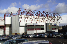 On 17 March 1932, Bradford City paid Midland Railway Company £3,750 for the remaining two-thirds of the site to become outright owners of the ground, which was now 45 years old.[19] The stadium had remained virtually unchanged since 1908, and did so until 1952,[8][16] when the capacity of the ground was reduced after examinations of the foundations were ordered following the 1946 Burnden Park disaster. The investigation resulted in the closure of half the Midland Road stand. The stand's steel frame was then sold to Berwick Rangers for £450 and a smaller replacement stand was built at Valley Parade in 1954.[19] Six years later, the stand had to be demolished for a second time because of continuing foundation problems.[20] It was another six years before all four stands at Valley Parade were able to be opened for the first time. To enable construction of a new stand on the Midland Road side of the ground, the club directors moved the pitch 3 yards (2.7 m) closer to the main stand. The new stand was then the narrowest stand in the league.[20] Further improvements were made to the stand in 1969, ready for the club's FA Cup tie with Division One side Tottenham Hotspur on 3 January 1970,[20] which ended in a 2–2 draw in front of 23,000 fans.[21] The cost of the work forced the club to sell Valley Parade to Bradford Corporation for £35,000, but it was bought back by 1979 for the same price.[22]