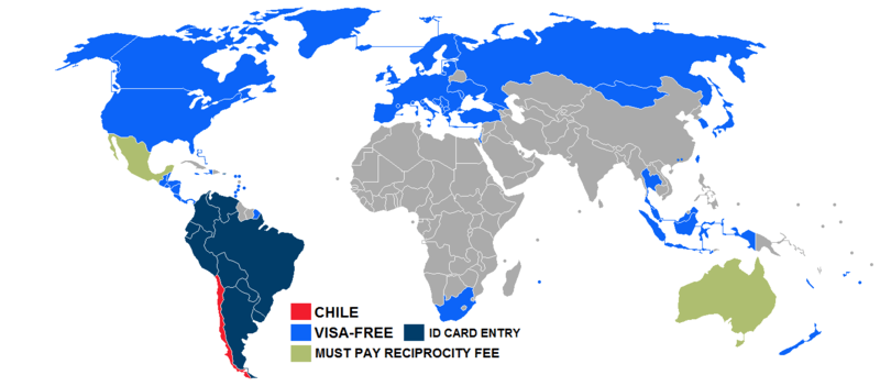 Citizens of the following countries can visit Chile without a visa for up to 90 days but they must first pay the reciprocity fee upon arrival:[4][5]