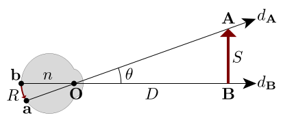 Figure 1 illustrates an observer's eye looking at a frontal extent AB that has a linear size S (also called its "metric size" or "tape-measure size"). The extent's lower endpoint at B lies at a distance D from point O, which for present purposes can represent the center of the eye's entrance pupil.