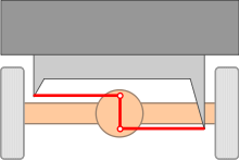 It consists of two horizontal rods of equal length mounted at each side of the chassis. In between these two rods, a short vertical bar is connected. The center of this short vertical rod – the point which is constrained in a straight line motion - is mounted to the center of the axle. All pivoting points are free to rotate in a vertical plane.