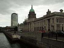 Vikings were the first settlers in Dublin and many Viking artifacts were found at what is now Wood Quay.[5] The quays were first developed during the time of King John in the early 13th century when the monarch licensed citizens to erect buildings on the River Liffey.[2] They became the center of the Irish shipping trade until the 1800s when the river in this section was considered too shallow for the more modern heavy ships.