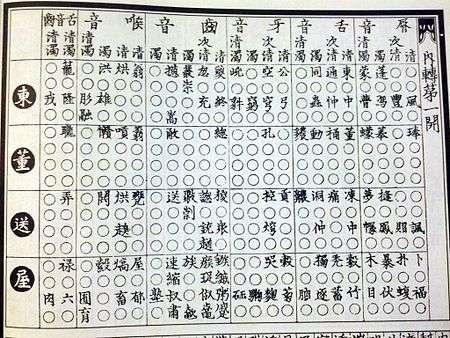 Each of the 43 tables in the Yunjing is first divided into four large rows that correspond to the four tones of Middle Chinese: the level tone (Chinese: 平聲; pinyin: píngshēng), the rising tone (Chinese: 上聲; pinyin: shǎngshēng), the departing tone (Chinese: 去聲; pinyin: qùshēng), and the entering tone (Chinese: 入聲; pinyin: rùshēng).[1] They are not explicitly marked as such, but the four characters are taken from each of the tone categories of the Guangyun rhyme dictionary. In the image at right, the first row – the level tone – is occupied by the level tone rhyme dōng 東, the second row – the rising tone – by the dǒng 董 rhyme, the third row – the departing tone – by sòng 送, and the fourth row – the entering tone – by wū 屋 (Cantonese: uk1).