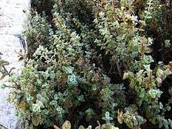 Thymus capitatus (also called Satureja capitata) is a species of wild thyme found throughout the hills of the Levant and Mediterranean Middle East.[11] Thyme is said to be a plant "powerfully associated with Palestine", and the spice mixture za'atar is common fare there.[12] Thymbra spicata, a plant native to Greece and to Israel has been cultivated in North America by Syrian, Palestinian, and Lebanese immigrants for use in their za'atar preparations since the 1940s.[13]