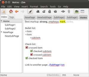 Zim is a graphical text editor designed to maintain a collection of locally stored wiki-pages.[1][2][3][4] Each wiki-page can contain text with simple formatting, links to other wiki-pages, attachments, and images. Additional plugins, such as an equation editor and spell-checker, are also available. The wiki-pages are stored in a folder structure in plain text files with wiki formatting.