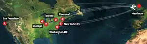 On 10 August 2006, British Home Secretary John Reid, broke the news, along with Douglas Alexander, the Transport Secretary.[33] The same day, Deputy Commissioner of the Metropolitan Police, Paul Stephenson, said that a plot, intended to destroy as many as ten aircraft in mid-flight from the United Kingdom to the United States using explosives brought on board in the suspects' hand luggage, had been disrupted.[9] News media reported that planned targets included American Airlines, British Airways, Continental Airlines, and United Airlines flights from London Heathrow and London Gatwick airports to Chicago, Illinois; Los Angeles; Miami; Orlando; Boston; Newark; New York City; San Francisco; Cleveland and Washington, D.C.[34] Air Canada flights were also included, with destinations being Montreal and Toronto. BBC security correspondent Gordon Corera said the plot involved a series of simultaneous attacks, targeting three planes each time.[35] Reports vary regarding the number of planes involved, ranging from three to twelve.[36][37] In a press release, the United States Secretary of Homeland Security, Michael Chertoff, said "multiple commercial aircraft" were targeted.[38] Some reports say the attacks were planned for 16 August, but police said no evidence of any specific date had been found.[39] British officials later stated that the estimate of ten aircraft was "speculative and exaggerated."[11]