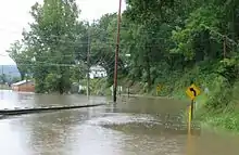 The Blanchard River was 7.5 feet (2 m) above flood level in Findlay, the highest level since 1913. A 92-year-old man drowned trying to get to safety after his car became trapped in floodwater near Findlay, where water poured into the downtown area from the Blanchard and its tributary creeks. One hundred thirty inmates were moved from a Hancock County jail. Bucyrus received 9 inches (229 mm) of rain, and several hundred people were evacuated from their homes in Crawford County.[3][47][48] The river also reached 8.7 feet (3 m) above flood level in Ottawa, Ohio.[49] Ottawa's Main Street (U.S Route 224) was fully flooded, as were homes and churches for blocks around. Between Findlay and Ottawa, Route 224 was washed out in several spots.[48] The fire department in Ottawa rescued dozens of people from their deluged homes by boat.[48] In Logan County, Stollysville's Lake Nixon was 7.3 feet above flood level, causing it to become contiguous with near by Lake Tuscaloosa. This flooded condition remained for 2 weeks before water levels receded enough to distinguish the two bodies of water. This flood occurred due to retention flaws in Stollysville's Nixon Dam, a problem which was solved by dam overhaul in 2010.