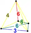 This configuration matrix represents the 5-cell. The rows and columns correspond to vertices, edges, faces, and cells. The diagonal numbers say how many of each element occur in the whole 5-cell. The nondiagonal numbers say how many of the column's element occur in or at the row's element. This self-dual polytope's matrix is identical to its 180 degree rotation.[5]