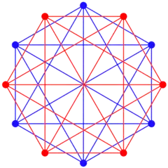 The compound of two 5-simplexes in dual configurations can be seen in this A6 Coxeter plane projection, with a red and blue 5-simplex vertices and edges. This compound has [[3,3,3,3]] symmetry, order 1440. The intersection of these two 5-simplexes is a uniform birectified 5-simplex. ![]()