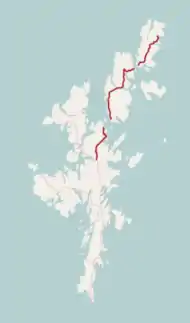 The A968 in Shetland is the United Kingdom's northernmost A-road.[1] It connects the islands of Yell and Unst[2] to the island of Mainland. The road is actually separated into three. The length of the part of the road on Mainland is 9.8 miles (15.8 km), on Yell 17.4 miles (28.0 km), and on Unst it is 10 miles (16 km). The road is marked red on most maps and goes from the A970 on Mainland to Haroldswick. It is 41.9 miles (67.4 km) long.