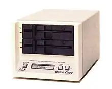 The Quick Copy series was ALF's first copier line to have its own built-in computer, rather than requiring an Apple II computer to function. The first model was introduced in 1987, and copied only standard FM and MFM 5.25" disks (such as the IBM PC formats).