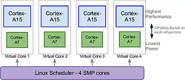The paired arrangement allows for switching to be done transparently to the operating system using the existing dynamic voltage and frequency scaling (DVFS) facility. The existing DVFS support in the kernel (e.g. cpufreq in Linux) will simply see a list of frequencies/voltages and will switch between them as it sees fit, just like it does on the existing hardware. However, the low-end slots will activate the 'Little' core and the high-end slots will activate the 'Big' core. This is the early solution provided by Linux's "deadline" CPU scheduler (not to be confused with the I/O scheduler with the same name) since 2012.[15]