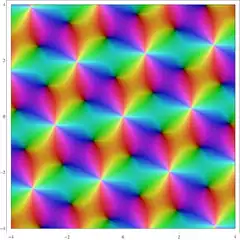 so that the function can equivalently be said to have the two complex periods ω1,2 = ω ± i ω' . Since φ(0) = 0, the function will also be zero in all points w = mω + inω' where m and n are integers. These zeros thus form a regular lattice in the complex plane as the poles also will.
