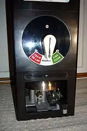 The block instrument consists of a small cabinet; its front face displays two indicators — telegraph needles — and has a commutator handle (some early designs of block instruments had miniature semaphore arms instead of needles). The upper indicator shows the state of the forward section, on the line leading away from the signal box. The commutator is used by the signalman to indicate the state of the section approaching his signal box, and the lower indicator repeats the commutator position. All indications are repeated on a similar instrument at the other end of the block section, in the associated signal box. The commutator has three positions and each of the two indicators has three positions: normal (or line blocked), line clear, and train on line. Either integral to the instrument or separately mounted, there is a single-stroke bell and a bell operating device, either a tapper or a plunger.