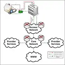 An access network is a type of telecommunications network which connects subscribers to their immediate service provider. It is contrasted with the core network, which connects local providers to one another. The access network may be further divided between feeder plant or distribution network, and drop plant or edge network.