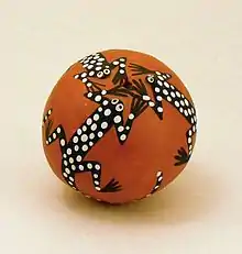 Acoma pottery dates back to more than 1,000 years ago. Dense local clay, dug up at a nearby site, is essential to Acoma pottery. The clay is dried and strengthened by the addition of pulverized pottery shards. The pieces then are shaped, painted, and fired. Geometric patterns, thunderbirds, and rainbows are traditional designs, which are applied with the spike of a yucca. Upon completion, a potter would lightly strike the side of the pot, and hold it to their ear. If the pot does not ring, then the pot will crack during firing. If this was found, the piece would be destroyed and ground into shards for future use.[11]