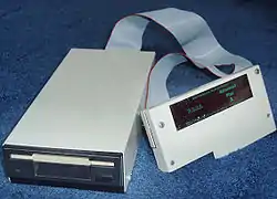 Produced by Advanced Computer Products (ACP) and sold by PRES, the Advanced Plus 3 (AP3) was a Plus 1 cartridge interface using the WD1770 controller, supplied with Acorn's ADFS and a single-sided 3½" disc drive for £99 plus VAT, offering equivalent functionality to the Acorn Plus 3.[74] Announced in late 1987, the product was made possible by an agreement between ACP and Acorn to license the ADFS software.[75] As with many disc interfaces for the Electron, since the interface provided a connector for the drive, this made it possible to connect a 5¼" floppy disc drive (more common amongst BBC Micro owners) or the more typical 3½" drive.